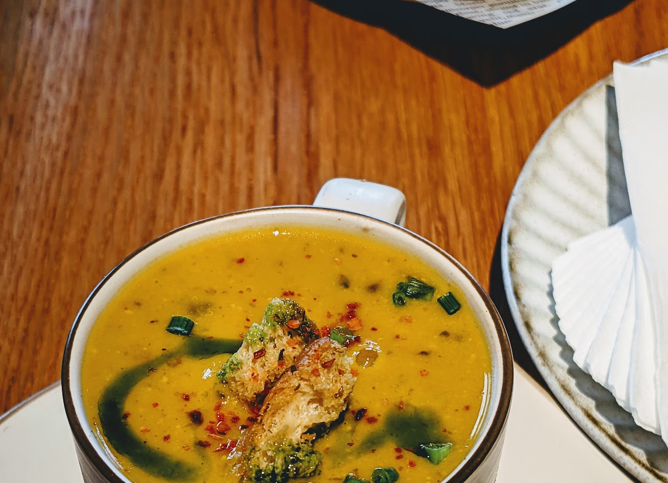 湯品是將各類蔬菜菇類烤過後在上桌後才倒入南瓜湯,湯碗一上桌就可以聞到濃濃的烤菇的香味,很開胃。南瓜湯味道醇厚將南瓜甜味表現的挺好。麵包則是沒有任何印象。