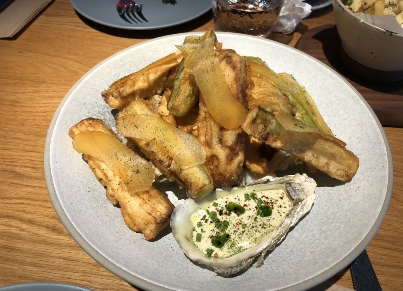 比較沒這麼推的:絲瓜薯條,就是蔬菜天婦羅,沒有馬鈴薯;主餐香煎海鱸魚也蠻普通的,建議主餐也一起分食多點幾道不同的吃吃看