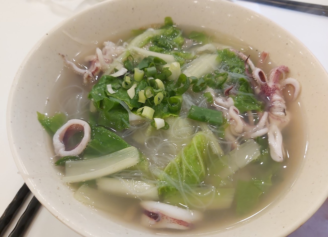 點了、加志魚湯、小卷鮮珂麵線、燙青菜。