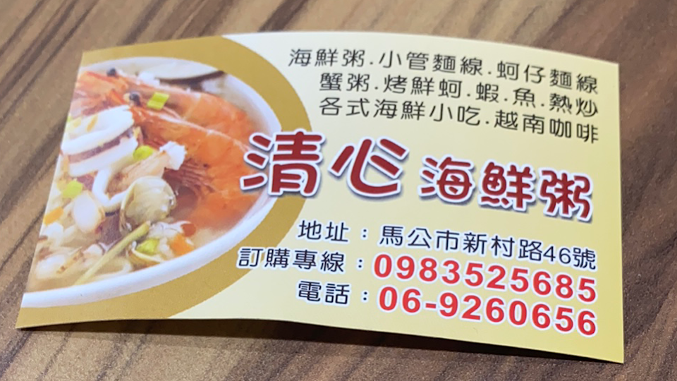 今天在澎湖西嶼,經過清心,想到網路上介紹了這家的海鮮粥不錯。一入店2:18分了,服務人員說只能外帶,所以我們點了一份海鮮粥外帶,打開之後真是驚為天人,與網路上的照片也差太多了,沒有蝦子、沒有海狗丸、沒有蛤蠣,只有一些牡蠣和花枝,真的很失望???? …