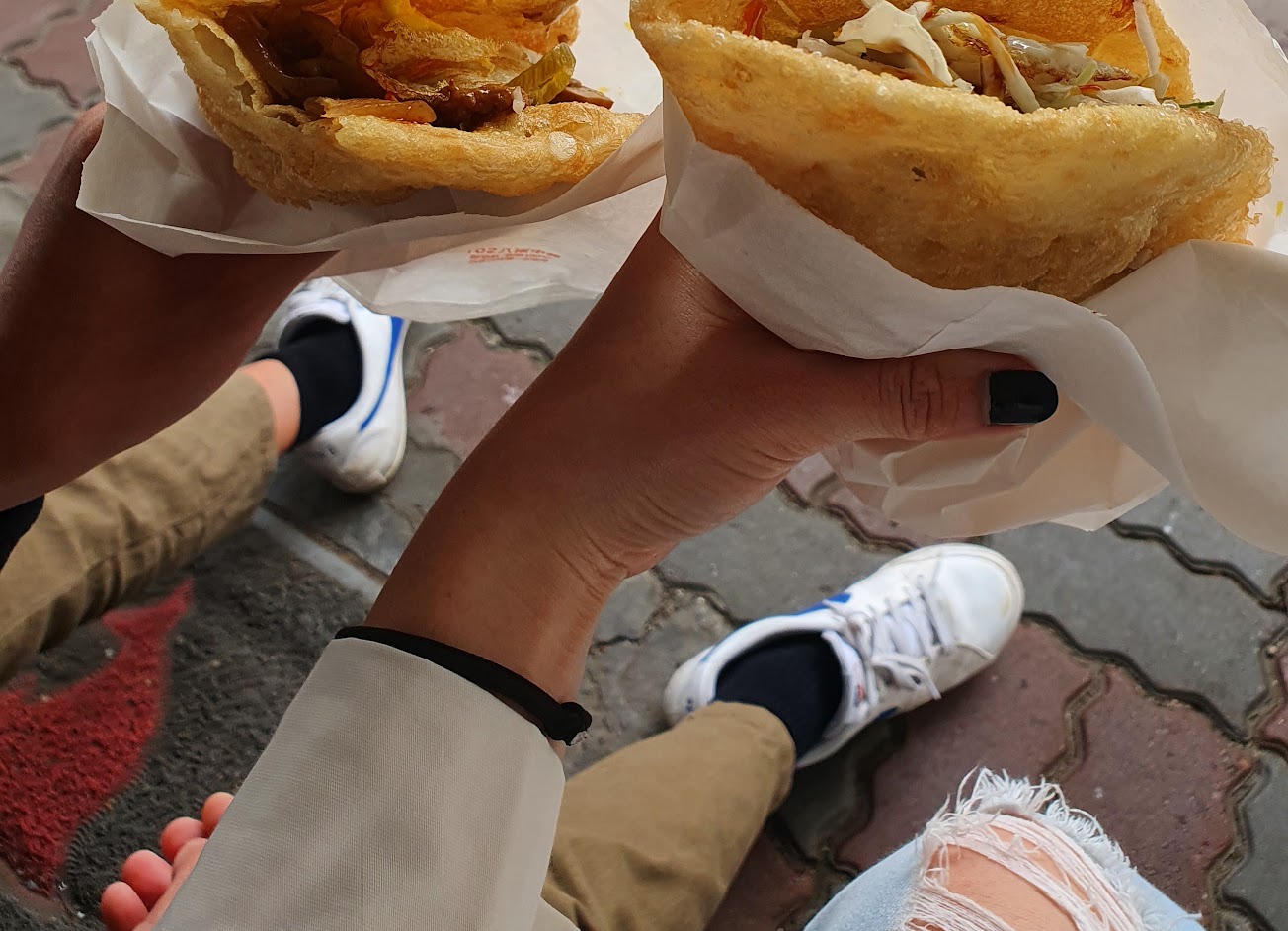 點了蔬脆蛋餅及咖喱蛋餅,嗯,蛋餅做法是酥脆,夾入不同內餡及蔬菜,咬一口,嘴中是多層次的感受,喔!特別是有酸菜,其他地方不常看到!價格還好,雖然有些油膩,但順便買附近當地仙人掌果汁,喝喝後,就非常的OK喔!