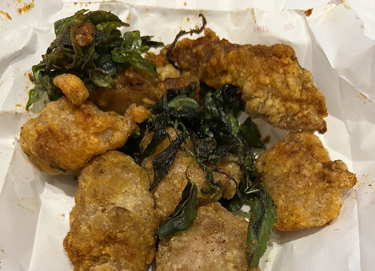 香酥雞肉$50 就是鹹酥雞的感覺~ 吃到的時候已經沒那麼熱了 但外皮沒有因為溫度變得濕濕爛爛的 雞肉很扎實!
