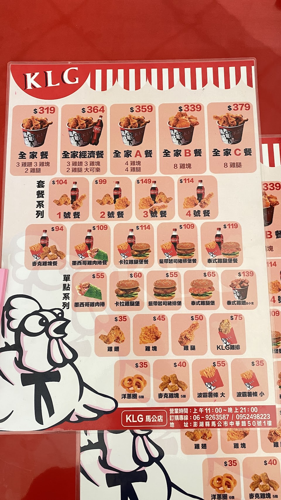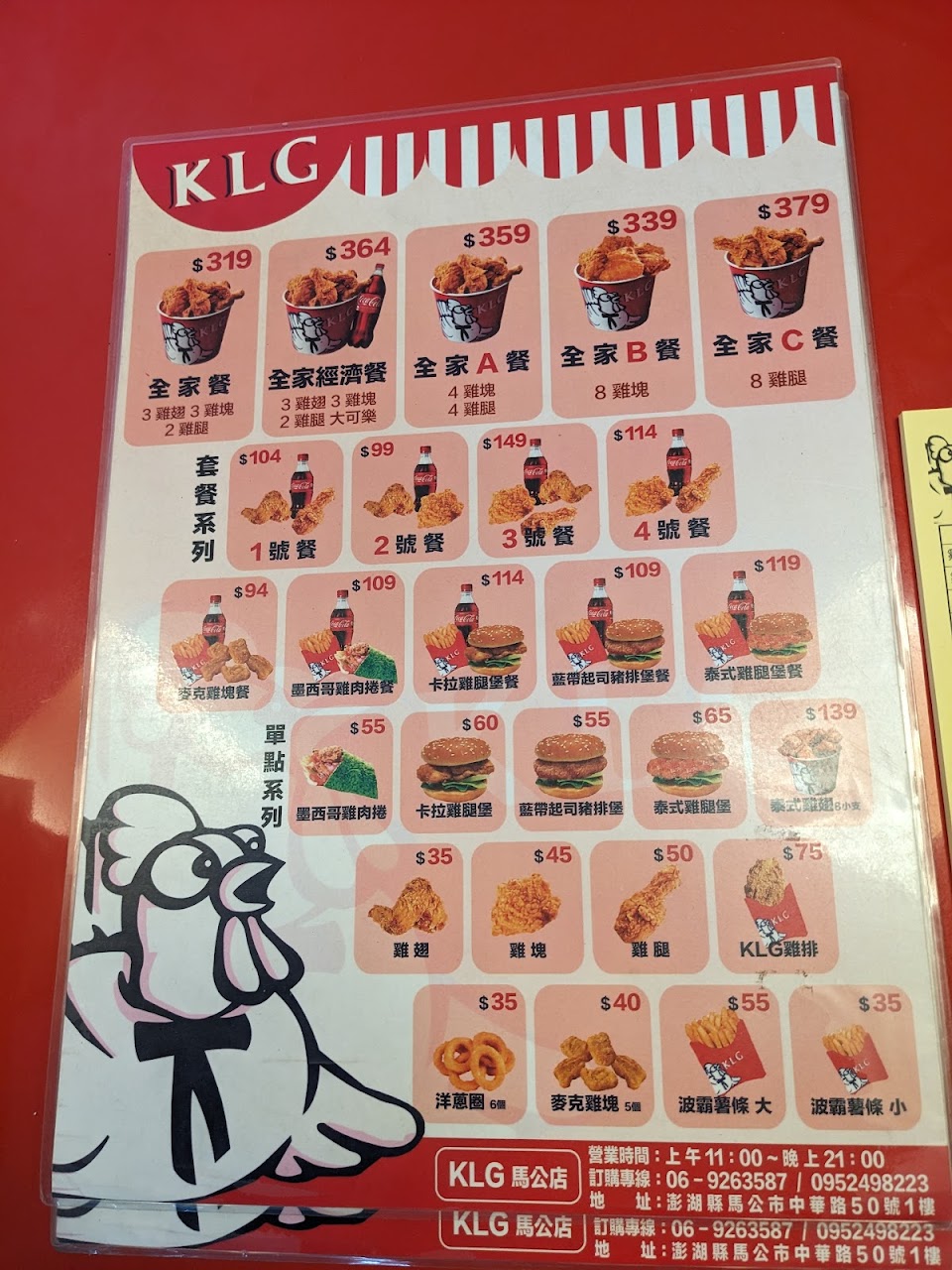 搬家了也漲價囉,各位要注意喔。雞腿50元,皮薄肉嫩,不錯吃,但腿的尺吋有點小,買的人可以自己比較看看。雞塊45元,現炸的,肉嫩,但皮有點厚,這是跟丹丹及拿坡里比較,不過澎湖沒有丹丹及拿坡里,只好充數一下,哈哈。 服務 外帶 餐點類型 晚餐 平均每人消費金額 $1-200 餐點:4 服務:4 氣氛:3 停車位 停車不方便 附近的停車場 付費路邊停車 停車場 建議先去電訂餐再去取餐,這樣,開車的人也不用臨停太久。