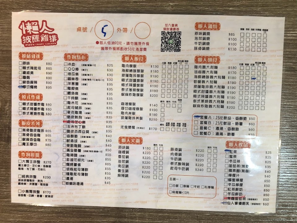 披薩雞排現點現做要等15分鐘我完全能接受 「但是」❗️❗️❗️ 一樣是點披薩雞排 同一個區塊「夏威夷」跟「厚切焗烤」差真的很多 一開始還想說不愧是95$的厚切焗烤,大塊很多 結果除了夏威夷披薩味道比焗烤好吃外 厚切焗烤裡面有四片基本上都是骨頭… 反而夏威夷是無骨雞排… 真是這樣以後請標示清楚啊⋯⋯ 多花15$吃骨頭我寧可吃無骨的… 服務 內用 餐點類型 晚餐 平均每人消費金額 $1-200