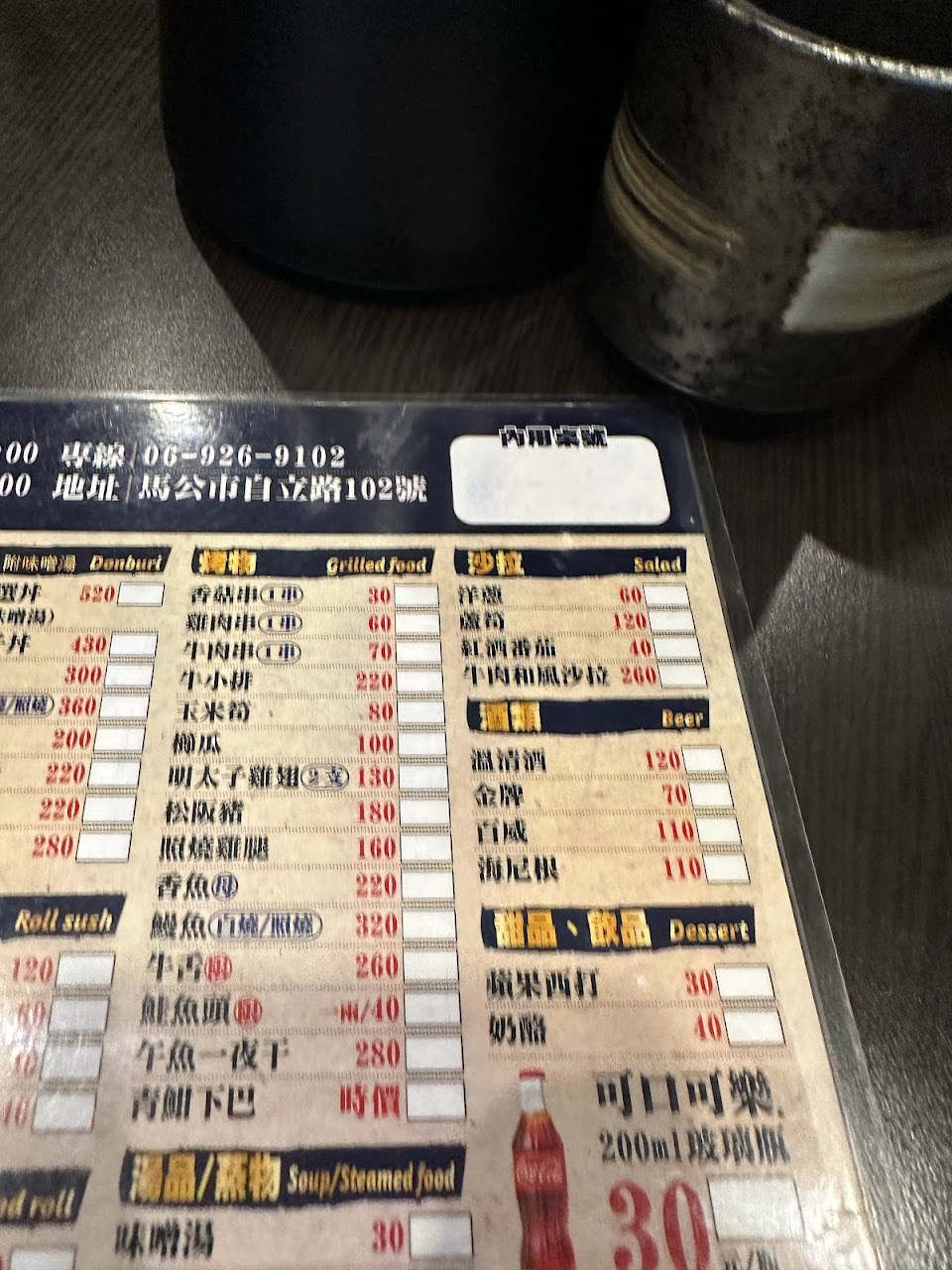 點了生魚片、牛肉丼、豬排丼、照燒雞腿丼、焦糖鮭魚酪梨卷、蘆筍蝦手卷、豬排、明蝦天婦羅、鮮魚味噌湯,除了牛肉丼覺得肉少了點,其他的份量足、美味足。是到澎湖最滿意的一餐!