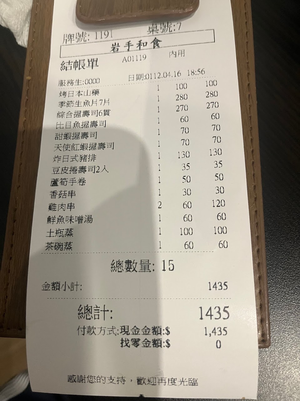 我們點完一次餐點後,突然想要換大盤的壽司、以及也跟店家多要了一杯水給小小孩喝,這幾次的互動,店員都很客氣,而且還再三提醒我,點大盤這種一定要等很久,加上店裡接近客滿的狀態,勢必要等上一陣子。但是我們仍堅持點了這個,速度並沒有想像中的久,一切都讓人滿意。(如果沒辦法等的客人,確實真的不要點這道比較好。)