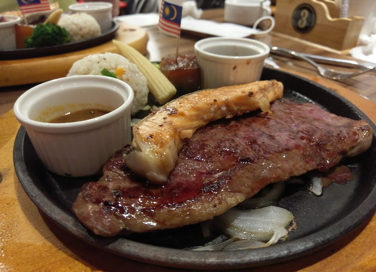 牛排點五分熟,上來時只有兩面已乾焦,放在鐵板上卻連中間都還是全生的,一切開後就請服務生在再送回廚房再煎過。