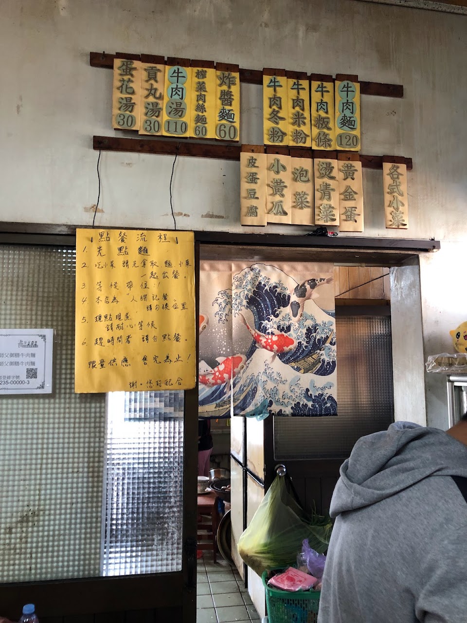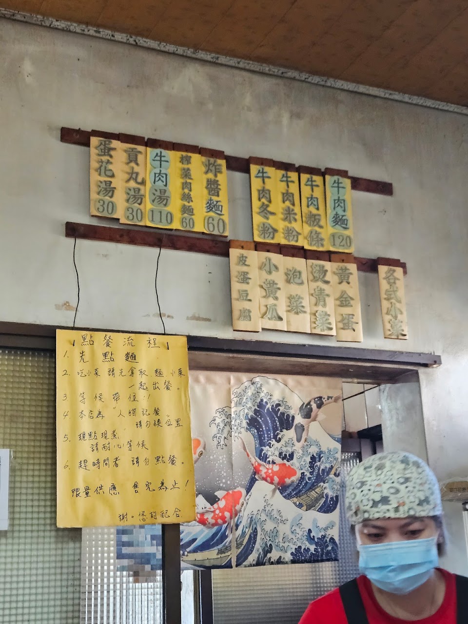 名過其實,附近查了google看了評價不錯,想說來吃看看,外面大概坐了10幾個人在等位子,等了45分終於排到最前面了,又過了一會有人吃完出來,想說怎麼都沒服務人員出來叫我們,就進來看,明明還有2桌空位,就先找了位子坐,沒有店員招呼,看了一下滷味自己夾,就夾了牛筋跟大腸,這時候有位比較老的店員從廚房出來,我詢問請問這片扁扁的滷味是什麼,店員說,你有位子坐了嗎?叫到你了嗎?我說外面已經排到我了,外面很熱,裡面有位子我就先進來了,店員居然叫我先把滷味夾回去,叫我去外面等@@,ㄜ,妳有沒有搞錯!後來較年輕的應該是老闆娘,嗓門頗大,其實我覺得不用用那麼大的音量伴隨著自認為有禮貌招呼客人的語氣在說話,其實聽的出來的人是會覺得不舒服的,好啦!總算點完餐,困難重重的終於吃到了牛肉麵跟滷味,牛肉麵湯頭中等,其實感覺不出18種中藥材熬煮的風味,牛肉是不硬不柴,但是剛好是我最不喜歡的牛腱肉,半手工麵條口感中等,沒有到非常有嚼勁,整體來說大約是70分的牛肉麵,滷味倒是炒的非常入味,但是太辣了,後來都用牛肉麵的湯先涮過一遍才吃!環境上是比較老舊,雖然整理桌面有用酒精擦拭,但是還是可以再加強清潔,有來吃過就好了,打著乾隆皇帝御用廚師御用配方名號的牛肉麵,我個人是覺得老兵的牛肉麵還比較好吃!