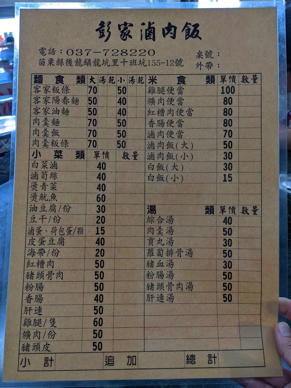 開車北上經國道3號至苗栗後龍交流道時已經時至中午,結果決定先下交流道找家店填飽肚子順便加些油。 就在 《台灣中油加油站》 隔壁看到這家 “彭家滷肉飯” 飲食店。 一進去店裡,老闆熱情招待入座介紹並介紹該店拿手小菜與客家道地麵點。 點餐後,不多久就送上客家粄條與幾種小菜。 客家粄條有 Q勁不軟爛、湯頭也好喝的確是客家口味。 點的幾道小菜也十分可口,有台式傳統小吃的風味! 該店離交流道十分接近,推薦 南下、北上 途經苗栗後龍時,可以到此地,加油吃飯稍事歇息後;再行趕路是CP值超高非常不錯的選擇!