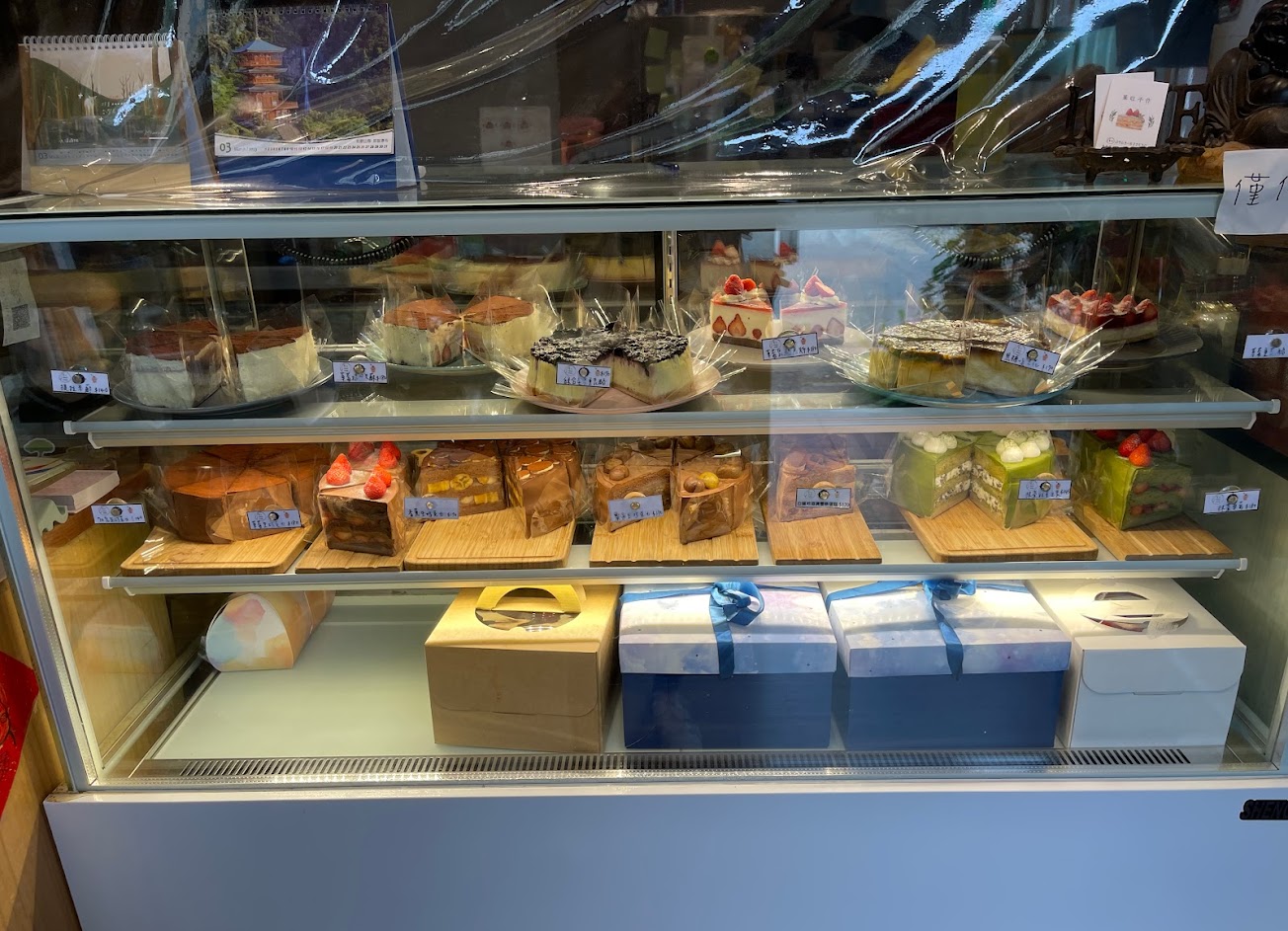 上週去,才開門一個半小時,剛進門內就發現切片蛋糕已經所剩無幾。在店門內外不斷湧進客人急迫下,無法靜心挑選口味,我只好大喊:「我每種都要一片」!