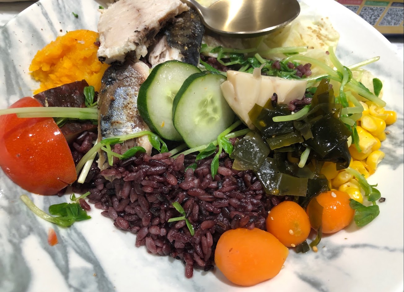 健康餐盒內容物有 小黃瓜 海帶 杏包菇 紅蘿蔔 番茄 豆干 地瓜泥 玉米粒 高麗菜 紫米飯是熱的!很像家裡自己煮的味道,吃起來沒什麼負擔