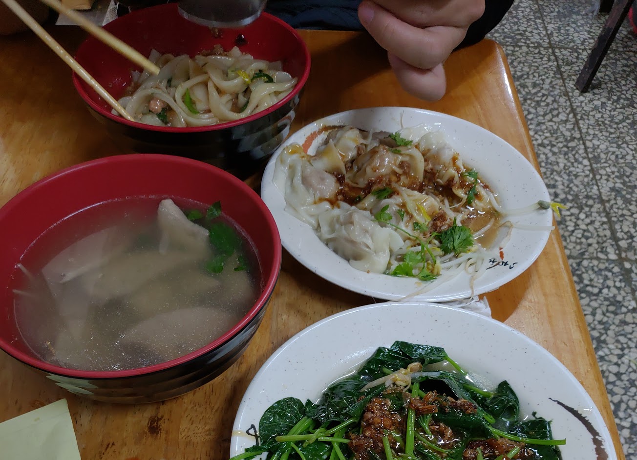 小菜點了肝連(好吃多汁Q)、嘴邊肉(還好偏柴)、豬頭皮(好吃多汁Q)、滷蛋(一般般)、海帶(一般般)、地瓜葉(不錯),主菜點了排骨麵(不推,很大碗,排骨也很多很大,但沒什麼特別~)、乾粄條(好吃QQ)、乾餛飩(好吃平薄,如果有紅油抄手我一定超愛~)