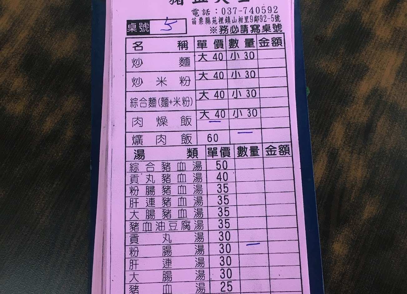 豬血大王地址位在二高苑裡交流道下,大約兩百公尺往苑裡市區方向處,店面不大停車方便。第二次來到此用餐,第一次點炒麵與綜合豬血湯 第二次點魯肉飯與綜合堂,綜合湯的湯料有著最不科學的豬血與大腸,對我來說這綜合湯是美味可口的,魯肉飯的料菜有加上酸酸,味道有些偏甜,至少還適合我的口味