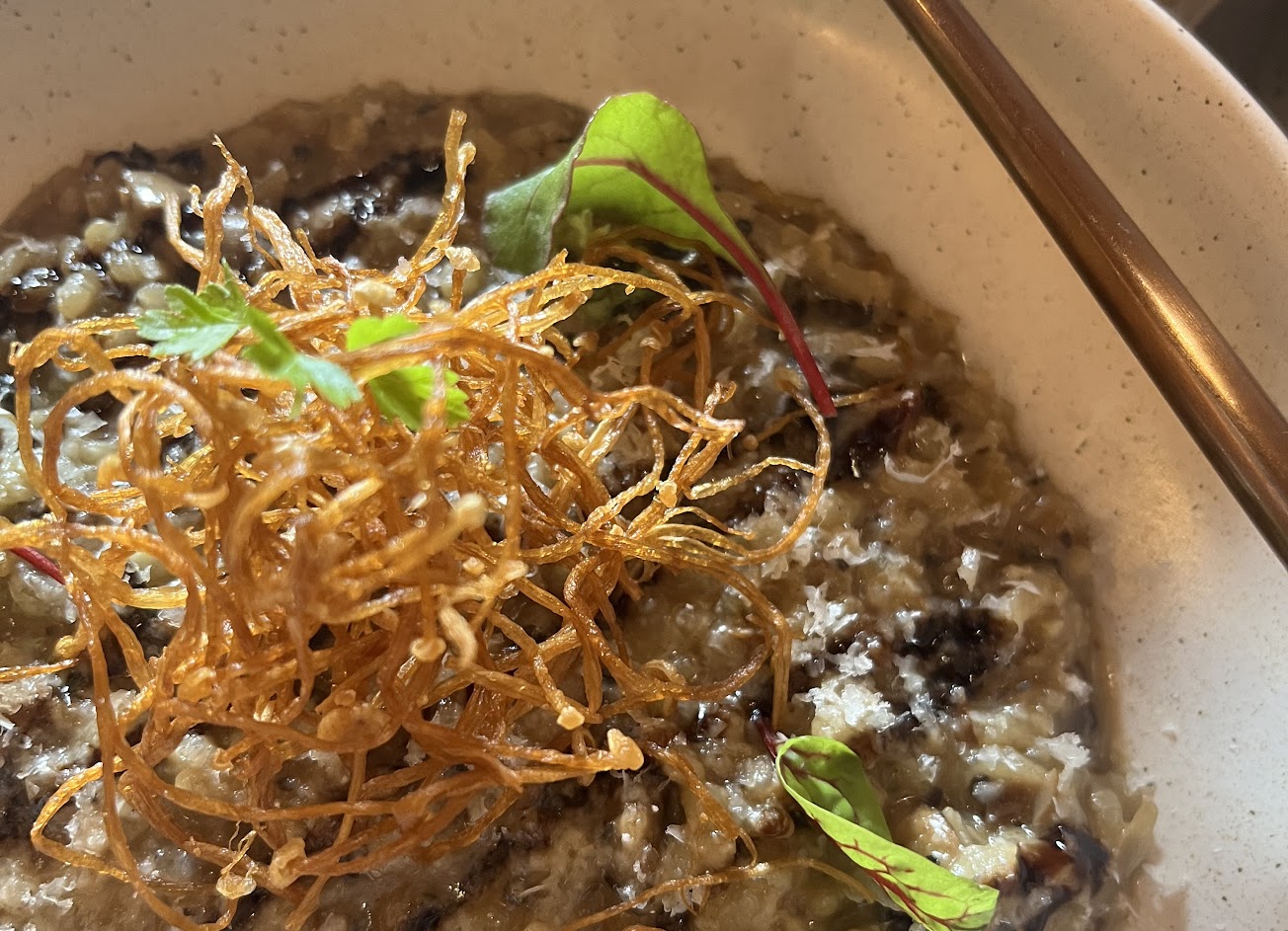 主餐:松露牛肝菌野菇燉飯,松露味明顯、上面有起司、巴薩米可紅酒醋、炸金針菇,讓你在嘴巴充滿松露味時,可以換換口味。