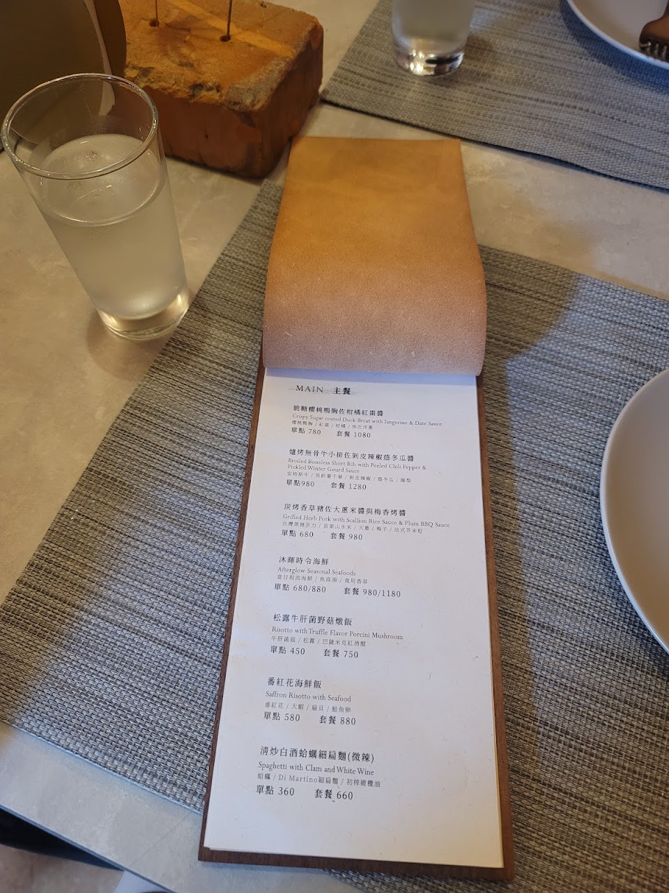 菜單上的價格,說是無菜單料理,但還是有各項主菜能選擇。用餐時間進入時就必須點套餐,其他時段則不清楚了。套餐價格最少1200起跳。菜單上最便宜的套餐是親子套餐,但限定有帶小朋友的家庭才能點選。說實在的,花了1200,感覺並沒有太多的飽足感。家人的感覺都是不如西堤,王品等連鎖餐廳。唯一有印象的是擺盤還蠻不錯的。