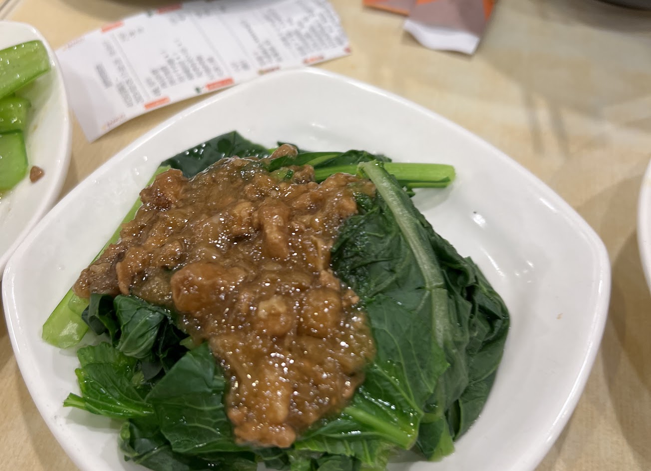 燙青菜超老。牛肉面,面Q但湯變淡,肉又乾又小。廚房一直傳出打噴嚏巨響,點菜員不親切。