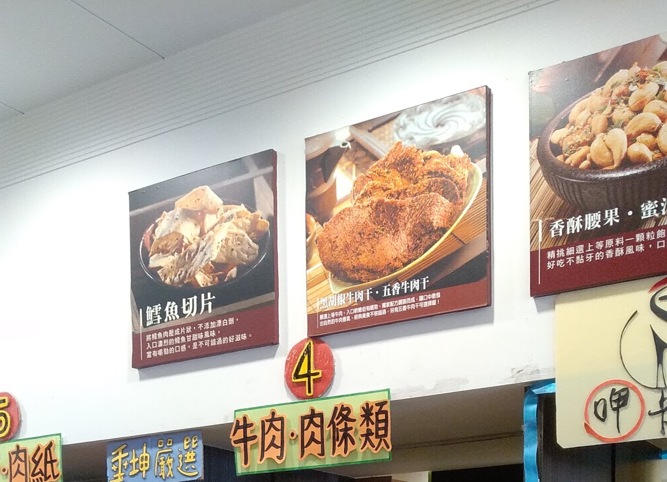 原味肉紙150元,口感薄脆,一入口的油膩感是這項產品的敗筆。相形之下快車肉乾的肉紙好吃很多。蜂蜜乳酪絲(素食)200元,口感一般。沙茶豆乾100元,偏油,與一般市售的沙茶豆乾差不多,並無特別之處。碳烤魷魚絲150元,普通。 品項很多,價格與一般市售相同的產品差異不大,但沒有特別好吃的產品,不用專程來買。有停車場,廁所乾淨。滿300元可以免費提供禮盒,結帳可刷卡。