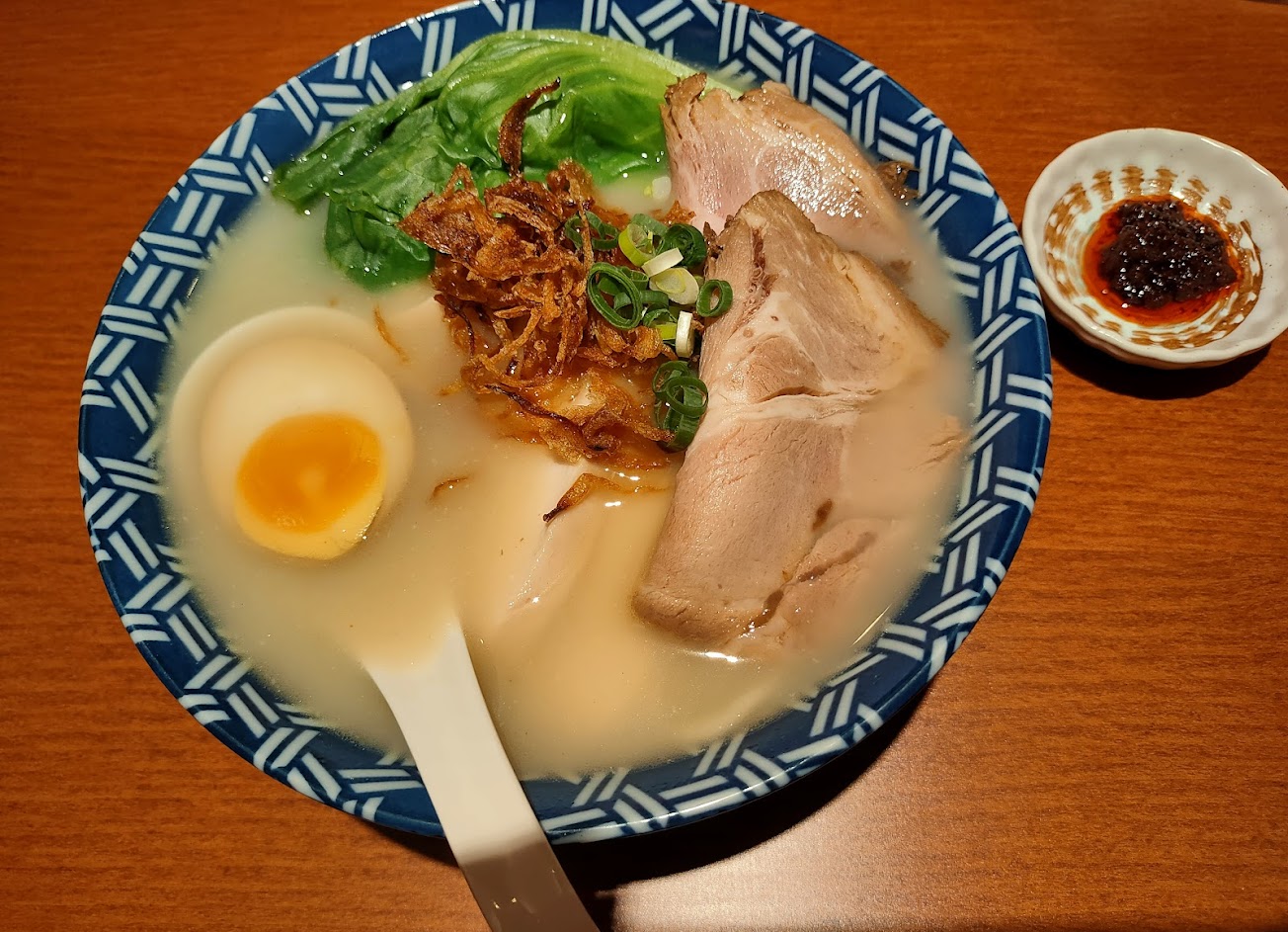 老實說,這碗麵有驚艷到我。第一眼看上去,覺得這個顏色怎麼可能清?白白的顏色感覺很濃厚。但一口湯下去,感覺好順暢!而且碗裡擺放的是滿滿的優質蛋白(丹麥梅花豬叉燒、舒肥雞胸肉與半顆溏心蛋)。麵搭配著炸洋蔥絲,把整體層次提升到更高的境界。湯喝到最後都不會有油膩感(因為它本來就是清燉的呀)。