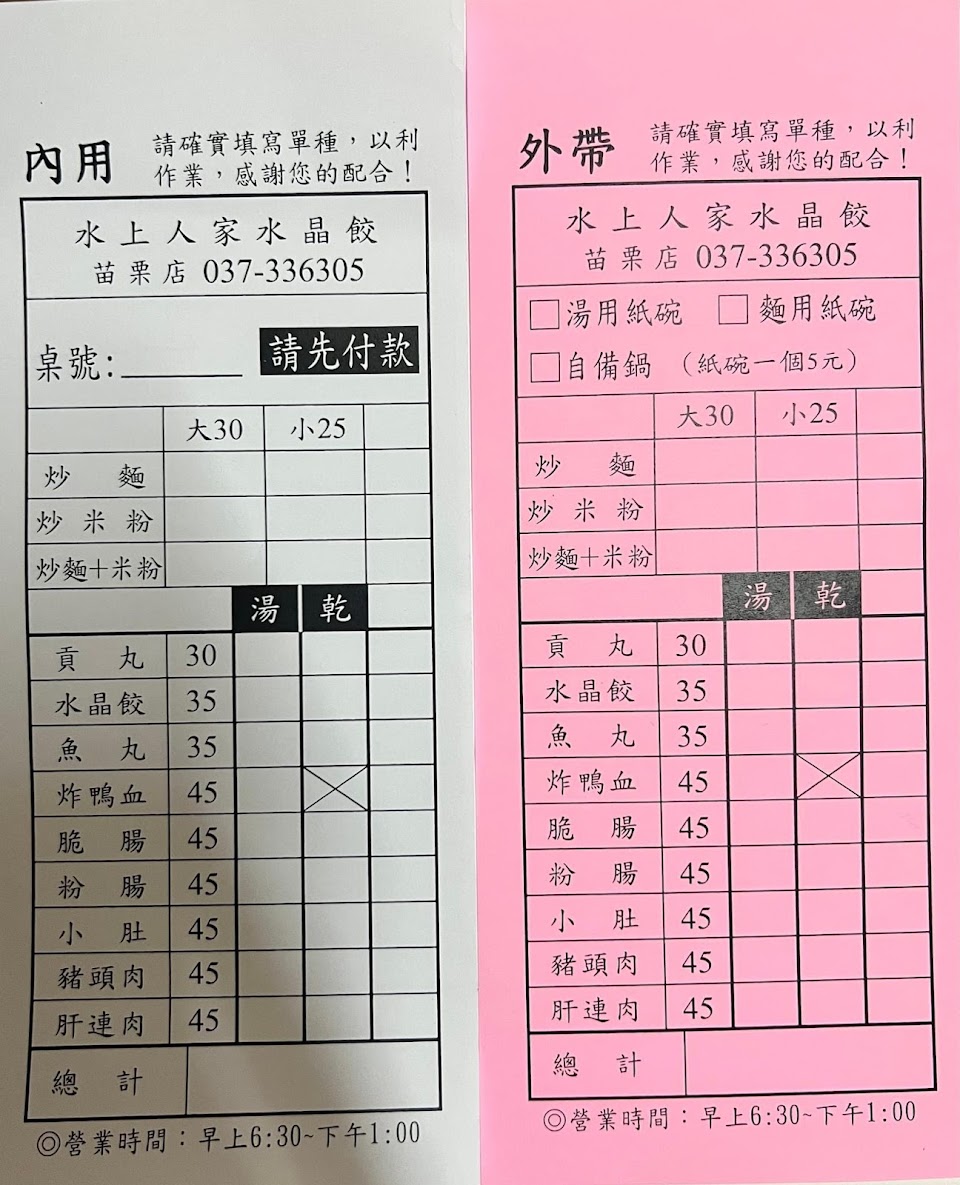 資深南苗在地人的良心建議,直接跳過這家,某個周五早上晨運完,本想去附近某歷史悠久的小吃店,但無力深入內巷且看這家店內座位很空,就走進去了…首先,我點的是 “米粉麵” + 粉腸湯,但老板娘上的是整碗麵沒有米粉,我糾正她後,她只是很淡定的說,“對不起蛤!”我絲毫感受不到她的歉意,其次,我加了擺放在桌上的辣椒醬,是塑膠罐底最後一勺,當時覺得有點怪,果然回家後胃絞痛、拉了兩天肚子~~ “水上人家” 這家在我小學時代是真正在“水上”經營的小吃,已經正式走入歷史,現在的是“贗品”,以上,我負百分百的言責!