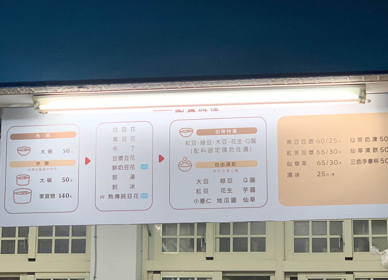 傳統豆花比黑豆花好吃。推薦招牌豆花,湯內淡淡的薑味很棒。(亦可不加薑汁)