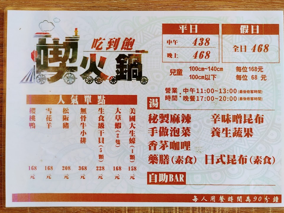週末晚上來的,$468元再加一成服務費,不到140cm的小孩$168,肉片有四種選擇,瘦牛最受我們喜愛,自助區選擇不多,但保持乾淨,東西也會一直維持足夠的狀態,服務人員很勤快,肉沒了會很快速詢問需不需要再來一盤,印象還不錯,算是特色餐廳?,老闆感覺也熱忱服務,有機會會再來光顧。