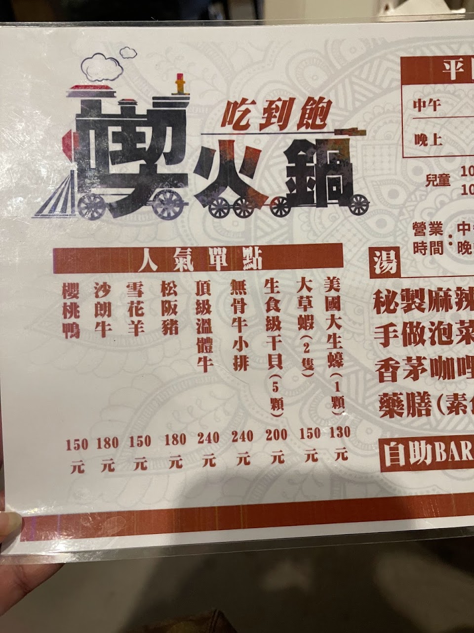 特地與朋友聚餐吃頓美食,進入充滿火車主題的火鍋店,蔬菜讓我覺得不是很新鮮(懷疑是不是前晚剩下的,午餐用餐),肉類偏薄,連火鍋沾料偏淡,要靠辣椒來提味,服務生懶散點,價格高,降到參佰左右還差不多囉!要多加改善(美食與沾料),調整品質才能永續經營(當下已列入黑名單中,打算過一陣子再給店家第二次機會嚐看看)。
