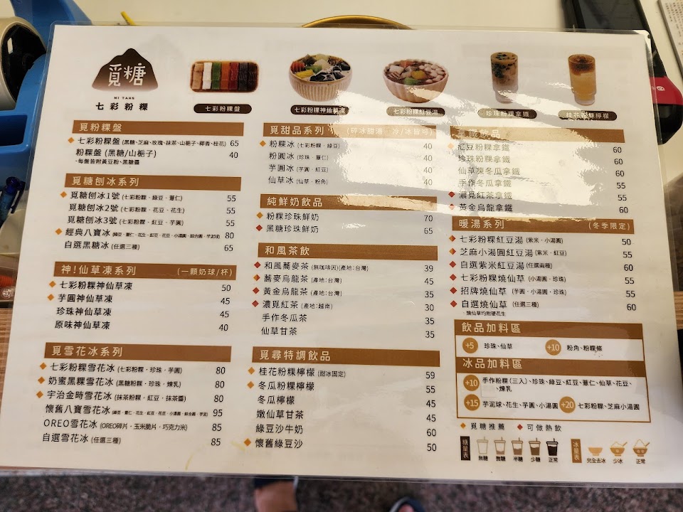 粉粿迷的天堂。 粉粿不甜,需要沾粉和配黑糖才會剛好。 雪花冰吃起來有冰淇淋的感覺,適合螞蟻人;剉冰壓得壓壓得,配粉粿和料,味道很剛好。 綠豆沙比較没特色。八寶冰也不錯,但不是走CP值路線,卻也配得起店內環境。 覓糖是讓人會想再訪的特色粉粿店。