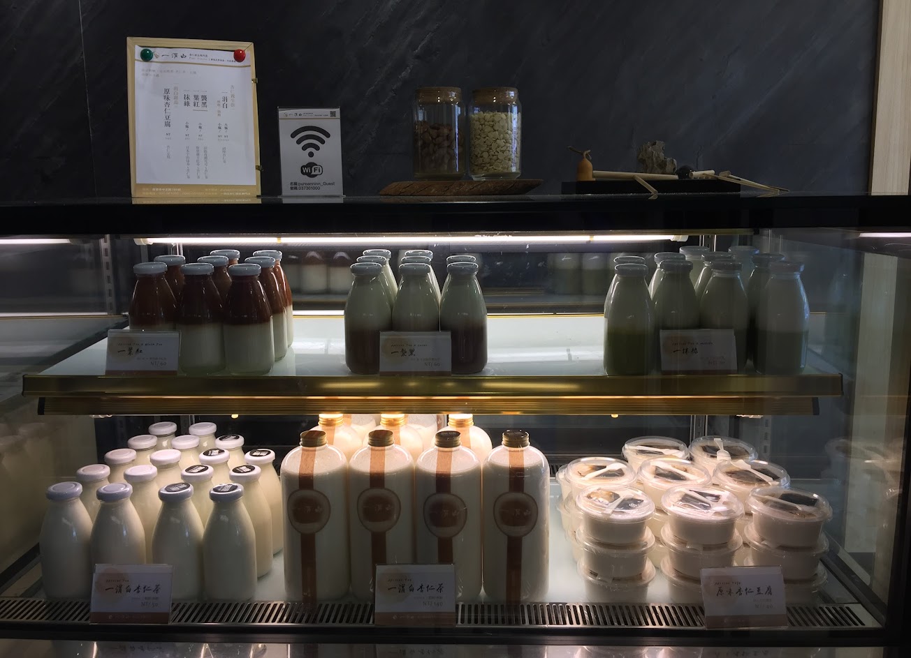 杏仁茶香濃好喝!招牌杏仁豆腐、芋泥、紅豆搭杏仁茶,冰冰濃濃的好好吃阿~~~裝潢很舒適,氣氛挺好,滿舒服的一間店!可惜抹茶杏仁豆腐賣完了….