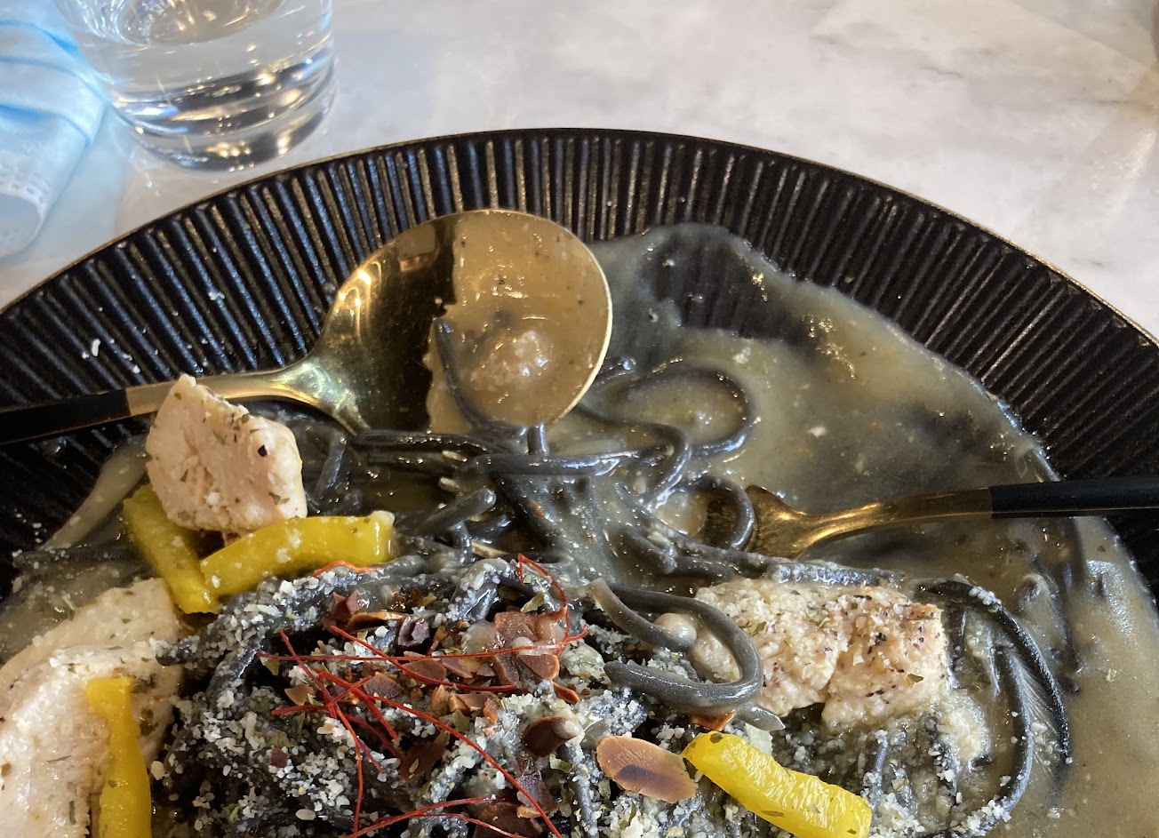 義大利麵都是黑色墨魚麵,醬料都是店家親自熬煮,每一口青醬都相當濃郁。