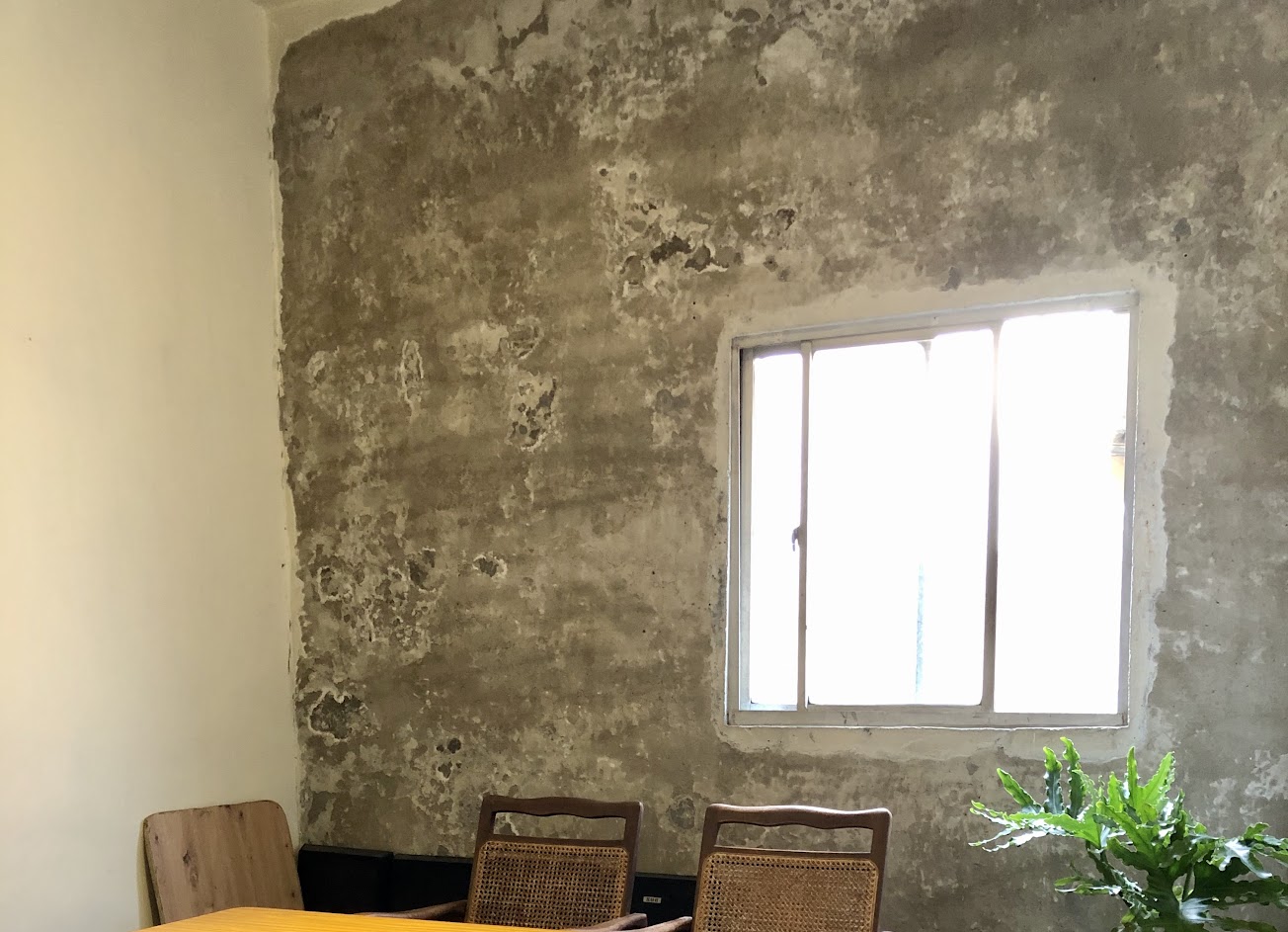 兩層樓的建築,門口的長椅是必拍的點,一樓大面落地窗搭配復古風格的裝潢,二樓無所不在的水泥元素跟古物營造了廢墟風。