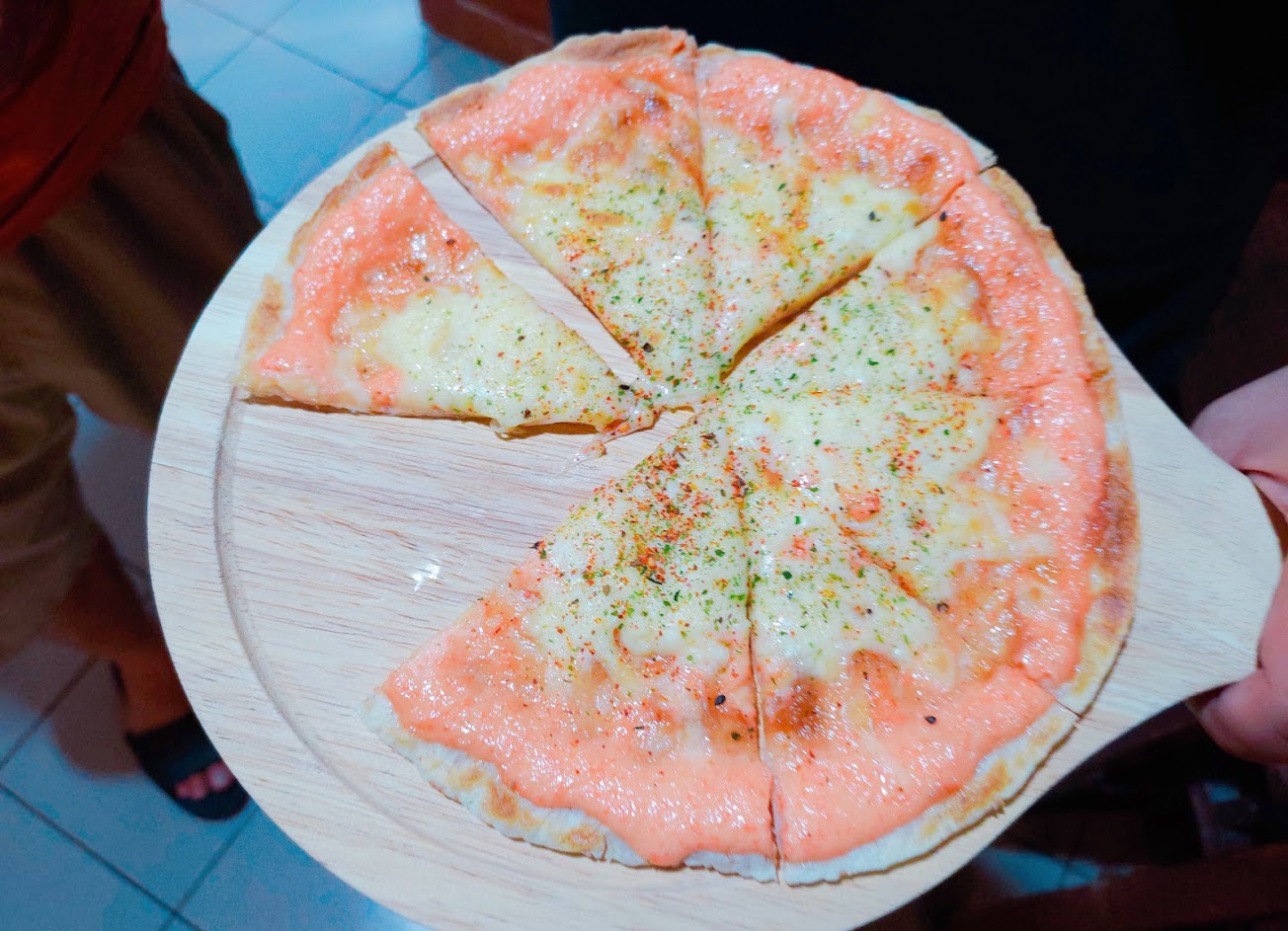 今天吃招牌明太子醬跟香蔥口味,烤餅是8吋,切成八片,現點現作現烤現吃,真的很好吃,也不用等太久,大概6-7分鐘,一次可以烤兩片。