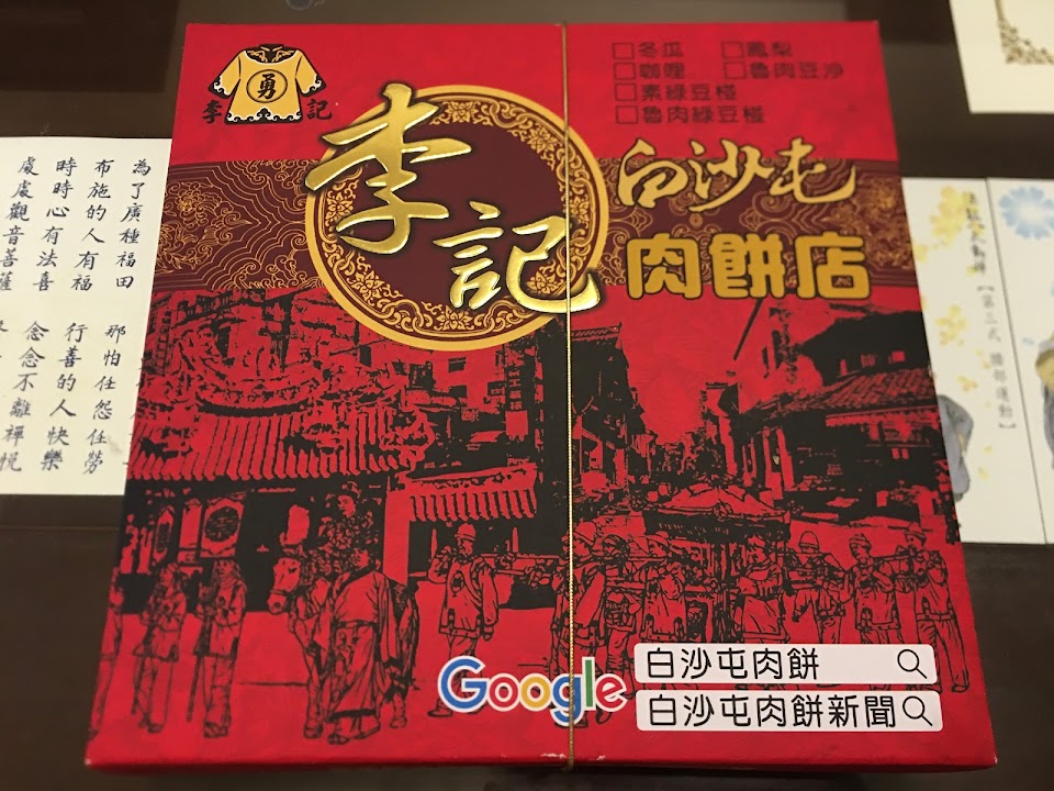 1月份來白沙屯拱天宮玩,看到這家餅店,順手買了白豆沙餅(5個一盒),老闆娘還送我們鳳梨餅試吃,離開前又再回頭買了女兒想吃的肉餅1盒。