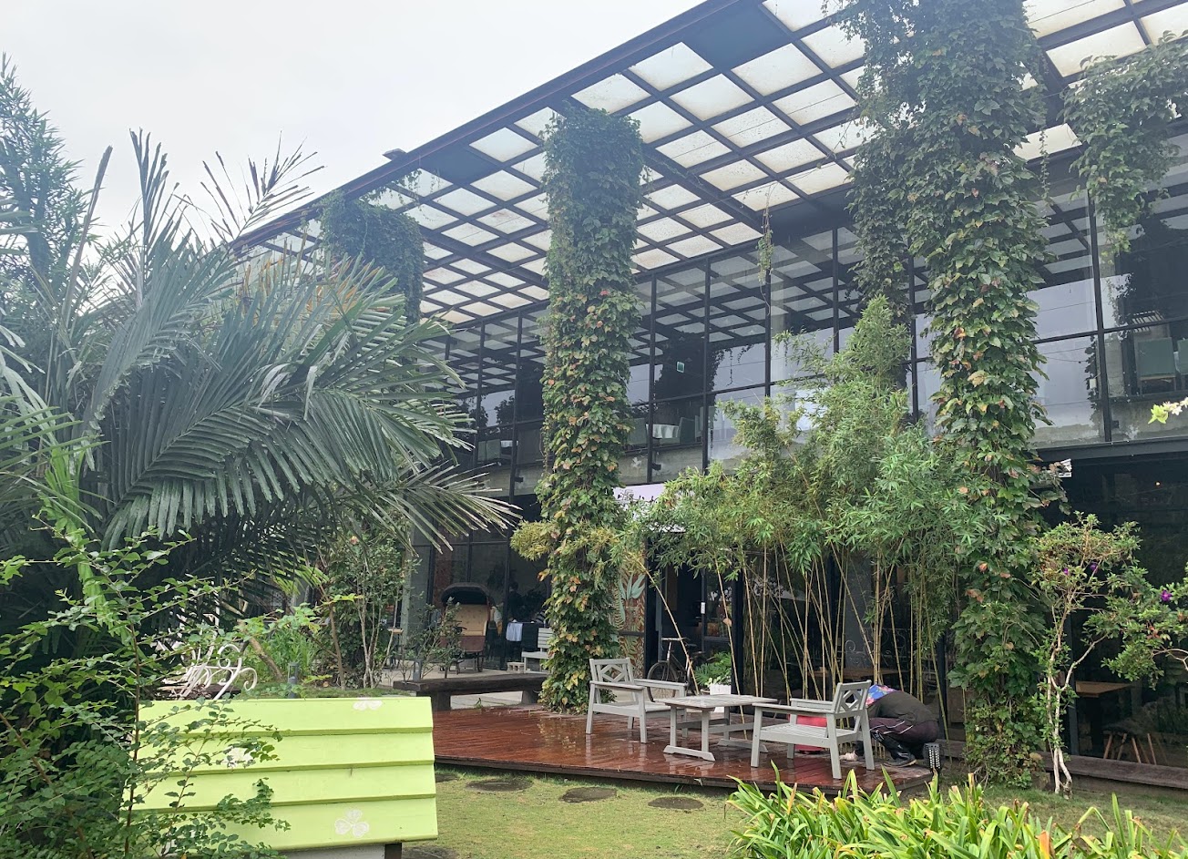 建築物正面看過去像是玻璃屋,室內設計走混搭風,清水模牆壁再加古典雕花,綴以綠色植物,餐桌用白色與淺色桌巾,椅子清一色的黑色餐椅,有一種走入現代與古典融合的豐饒韻味~