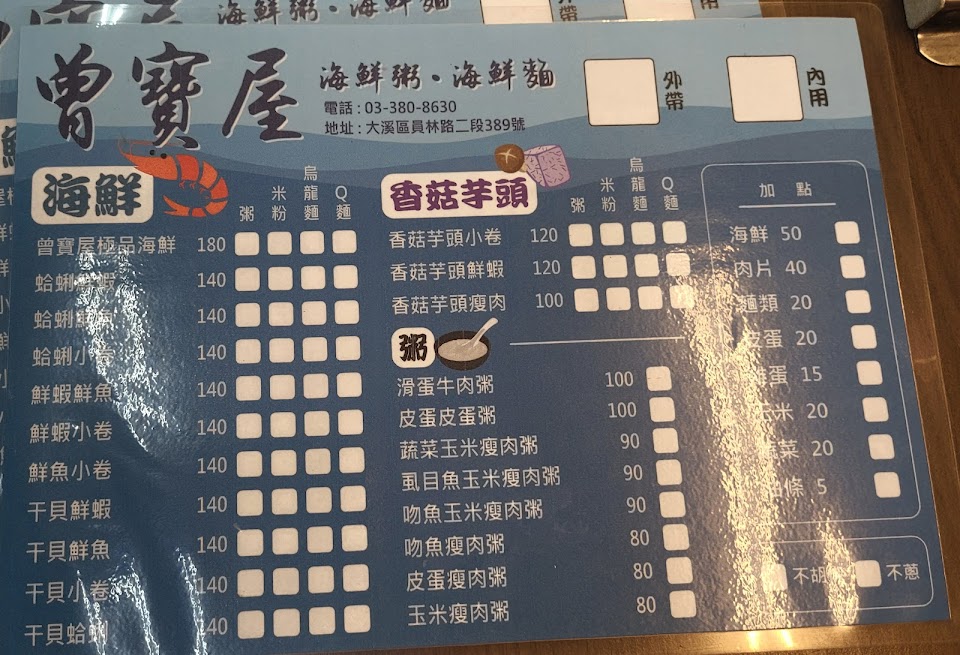 2024最新在地推薦餐廳的菜單_曾寶屋海鮮粥。海鮮麵的菜單、圖片