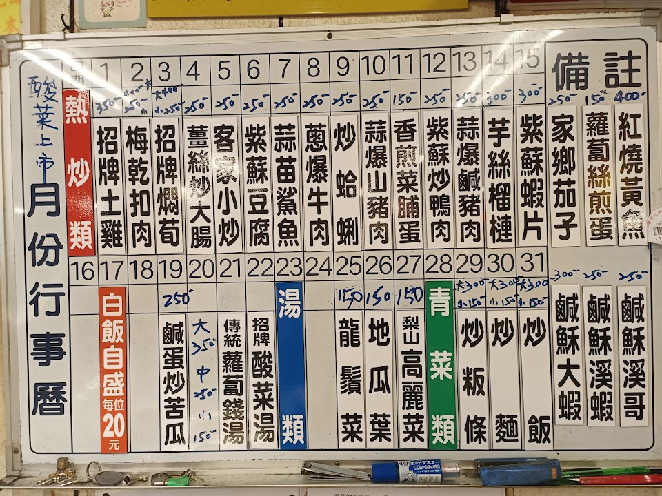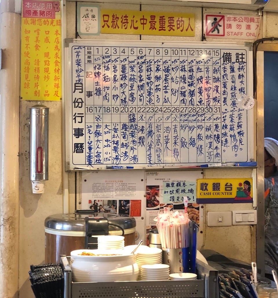 菜的樣式比起一般快炒店來說較少,且要自己手寫菜單,飯、茶跟小菜都吃到飽,是傳統客家食物:客家小炒、蘿蔔錢湯、筍乾、土雞搭配酸酸的醬,具特色,色香味俱全。