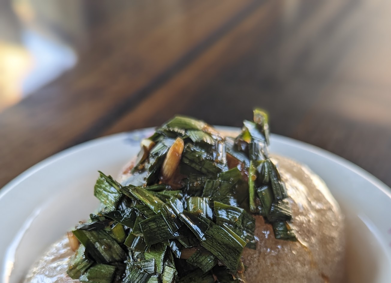 油炸小肉圓,上覆韭菜。皮Q、肉餡味道還行。