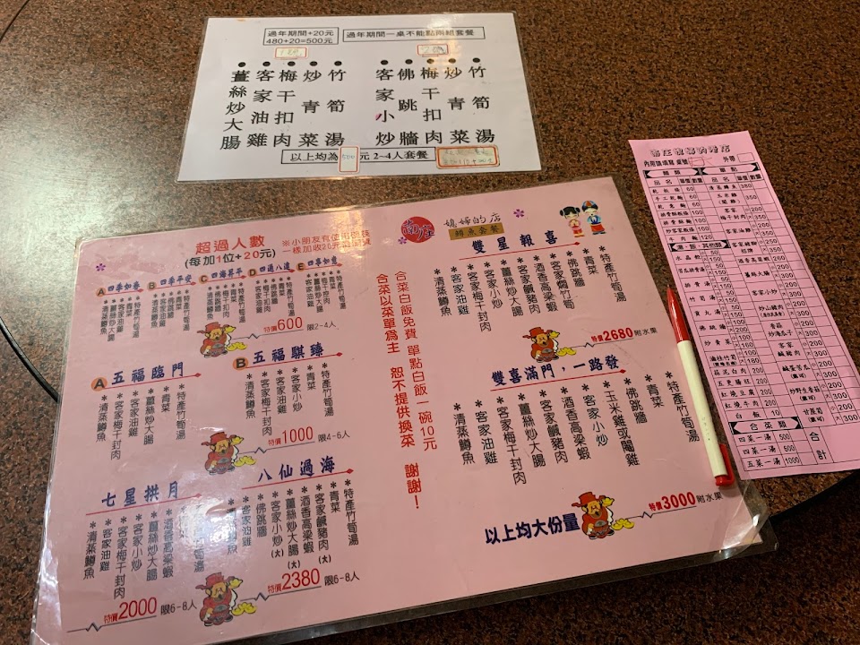 我們點了合菜外帶,份量十足,梅干扣肉很軟爛入味,好吃,油雞軟嫩入味好入口,客家炒鹹豬肉不錯,炒青菜跟筍湯較普通,加點的炒海瓜子份量超多,白飯也給得很足。整體來說CP值很高。