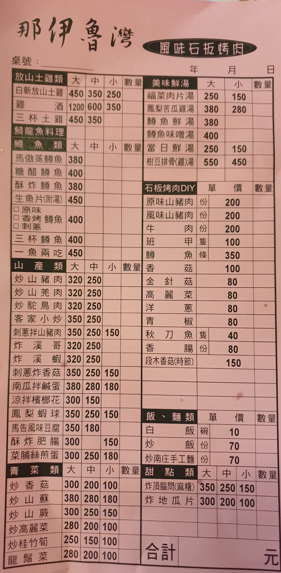 深山老林中的一家餐廳,主打原住民風味餐,DIY石板烤肉最為特色,餐廳氛圍十足,服務人員也親切,幾乎都是預定客人,中午11點臨時來還好碰上最後的位置,不然就再次無緣了。平日是不做晚餐的,建議先預訂,不然很可能敗性而歸。 炸肥腸口味不錯,也有嚼勁。 鱒魚一魚兩吃(清蒸與魚湯)口味中規中矩,清蒸魚魚刺較少,魚湯細刺就多一些。 石板烤肉DIY是選擇原味山豬肉搭高麗菜與端段木香菇,自己處理也是有趣,口味清淡,是很棒的體驗。 甜點炸地瓜片,搭配梅粉熱熱的吃,別有一番風味。 服務 內用 餐點類型 午餐 平均每人消費金額 $200-400 餐點:5 服務:5 氣氛:5 特殊餐點 石板烤肉DIY很特別,過程也很有趣,石板下有瓦斯加熱,在這個氛圍中用餐,更有一番滋味。