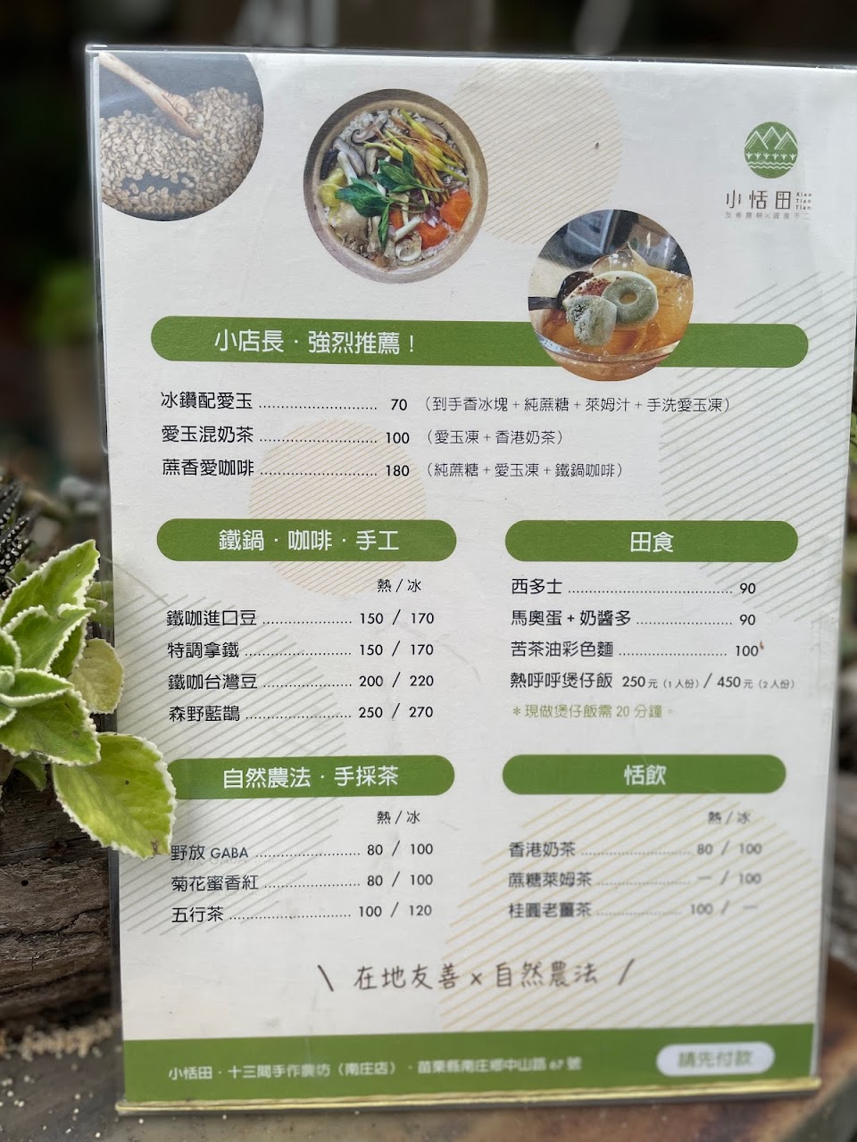 店名【恬靜美麗的田園】,坐落在國際慢城~南庄13間老街上。融合嘉義香港醞釀而成的愛情,讓這條幾乎被遺忘的街道上飄出在地濃郁的咖啡香,滿溢台灣小農手工的香醇愛玉。身為苗栗縣【十三創意街區漫慢遊】示範店家之一,希望有來到南庄的貴賓,不要去人擠人了,來這條街走走,來這裡坐坐,因為還有茶香、甜蜜、純糖……。