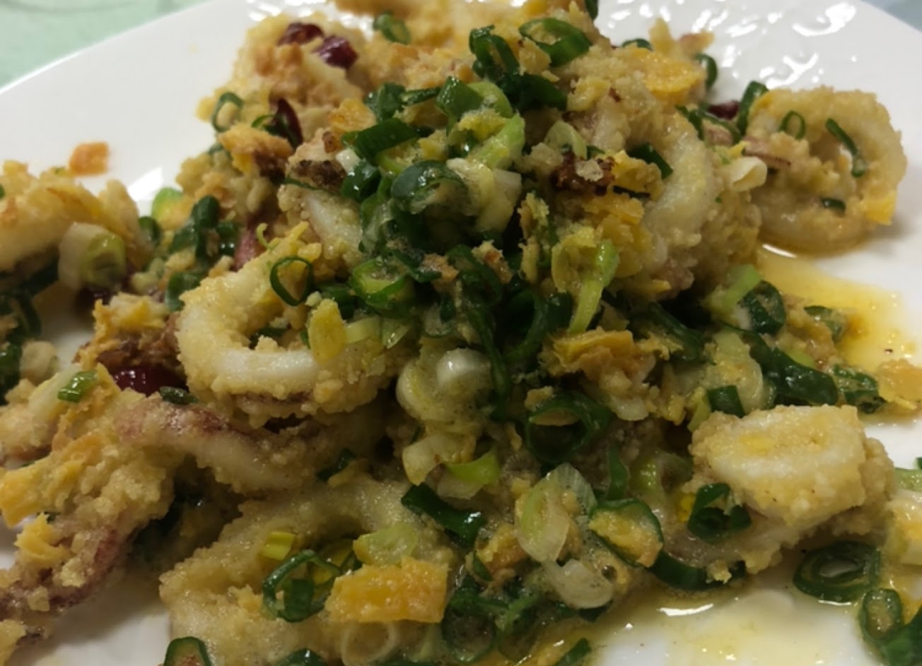 金黃鹹蛋黃包覆著炸的酥脆的中卷配上炒至入味的蔥絲及辣椒片