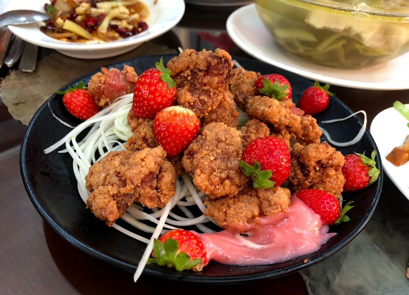 草莓排骨很特別,用草莓醃過的排骨,炸完一咬下去草莓香四溢。