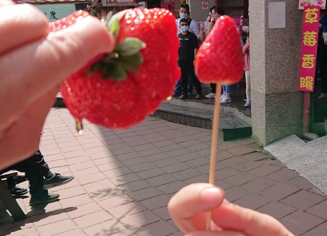 外頭小吃有草莓香腸、草莓貢丸、草莓霜淇淋、草莓雪花冰、草莓泡芙、草莓大湖等等。