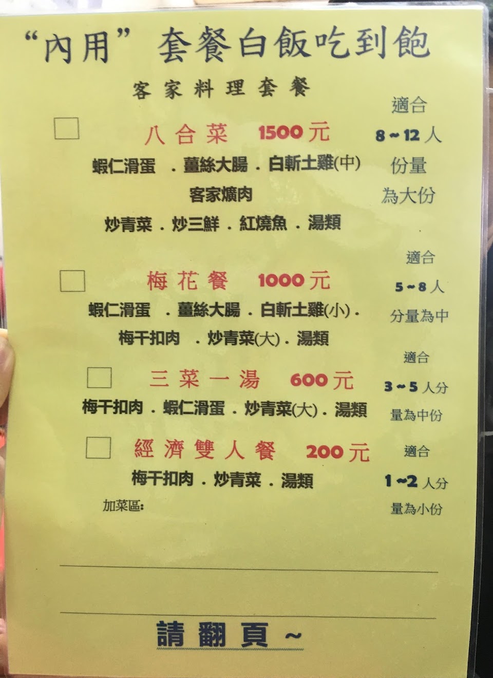 還有客家料理合菜套,600 元/1000元/1500 元,如果只有 2 個人,也有 200 元的套餐呢!