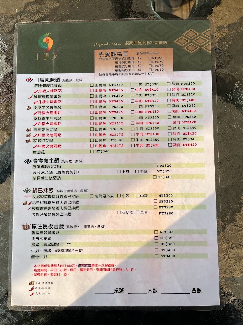 火鍋跟山豬肉都很好吃,老闆很客氣,下次來泰安會再訪,附餐飲料的桂花茶也很香