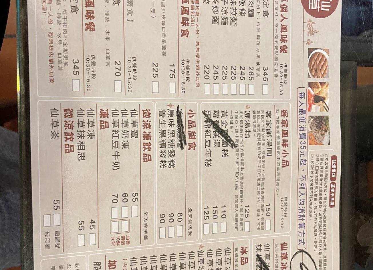1.最有特色的是仙草炒粄條!麵條是黑色的仙草味道很特別! 2.黃金蘿蔔糕有三個醬可以沾: 金桔醬、蒜頭醬油、辣椒籽醬,這個也還不錯! 3.客家風味定時今天吃到的是梅干扣肉,味道也還不錯 4.客家鹹湯圓有韭菜豆芽菜調味也不錯,不過個人覺得湯圓有幾顆些微酸酸的 5.漉湯米齊好吃,黑糖薑汁辣辣甜甜地配上軟Q的湯圓,附上一杯仙草茶讚讚 6.仙草地瓜芋圓紅豆牛奶冰(去冰)ok!