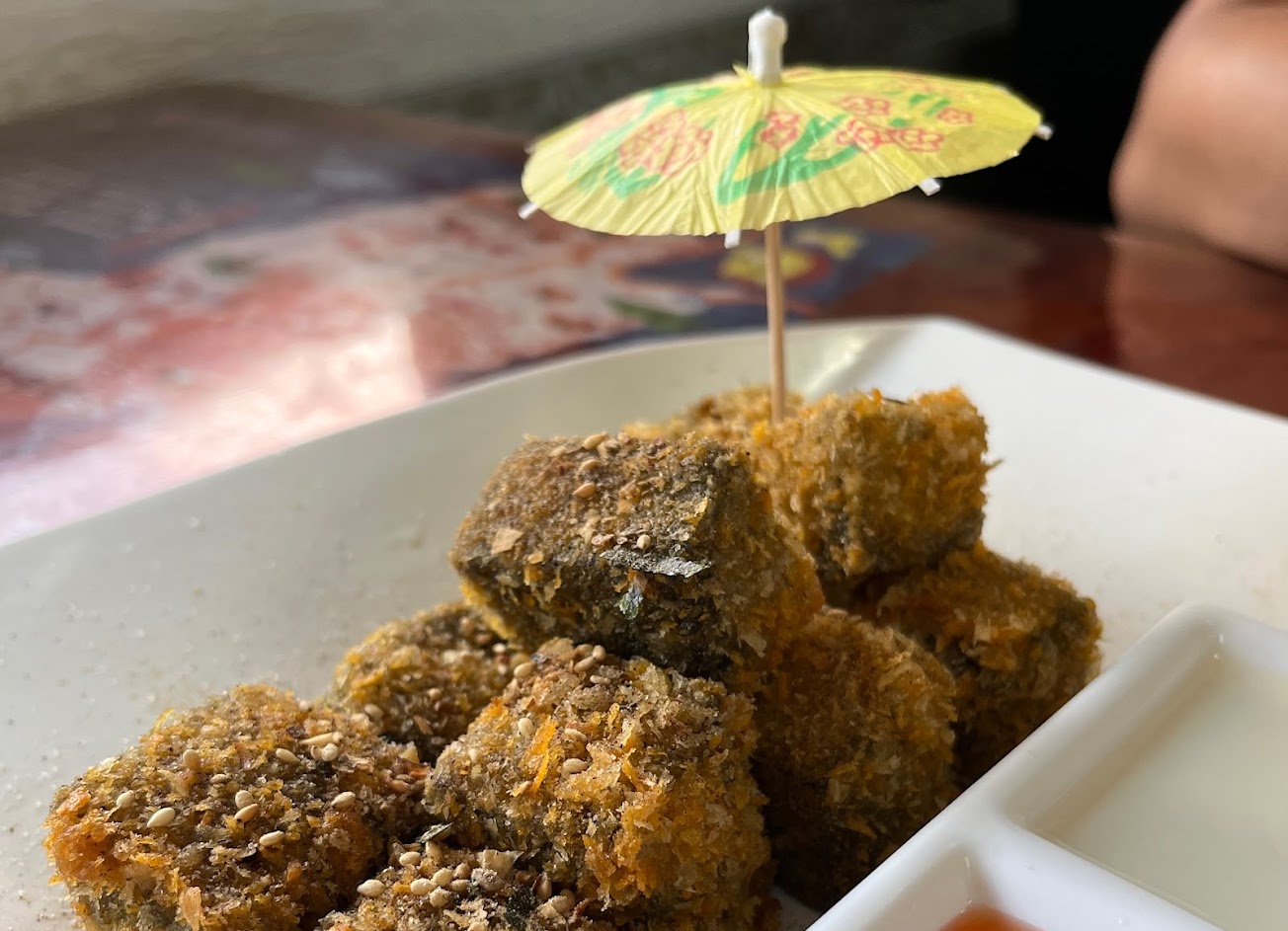 炸仙草類似炸雞蛋豆腐但口感較韌,沾白醬口味鹹甜,紅醬為一般不太泰式的泰式酸辣醬。最成功的應該是外皮的部分,完好附著在仙草上,不會切開就散。