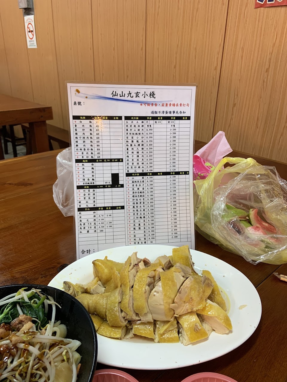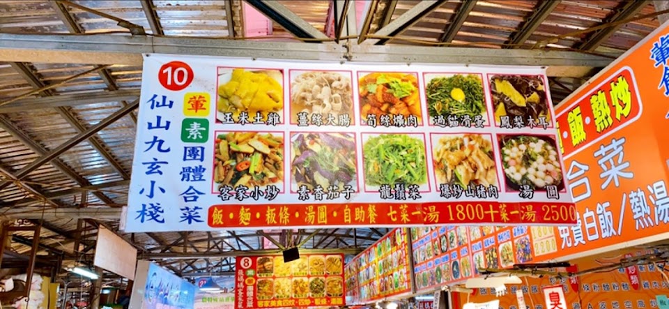 每次來獅潭仙山靈洞宮拜拜後,廟前仙山美食廣場內的九玄小棧~幾次消費下來,成了我們固定光臨的店家。店家小姐在自助餐菜色上,計價公道,不會亂算,其他販賣品項均有明確標價!有時攤前也會擺放一些土雞蛋?、蔬菜?等農產品販售,品質不錯!另外,今天的麻辣臭豆腐/豆皮比較沒有入味。玉米白斬雞肉份量/品質佳,好吃價格實惠!而且,白斬雞這個份量兩個人吃OK 的,價錢上也比較能接受!還有,桌上的素食辣椒很夠味!嗜辣的愛好者可以買一瓶回家享用!⋯短暫停留用餐的片刻中,觀察到店家非常用心經營、真誠招呼客人!我們來仙山都是星期假日來均居多⋯平日美食廣場的營業狀況就不了解了!給大家參考!!