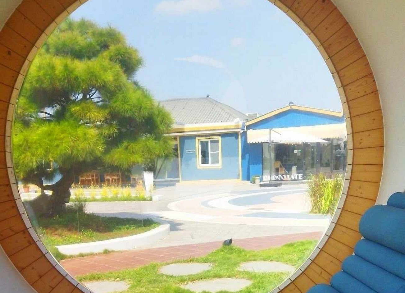 藍黃撞色的建築搭配藍天美到像幅畫