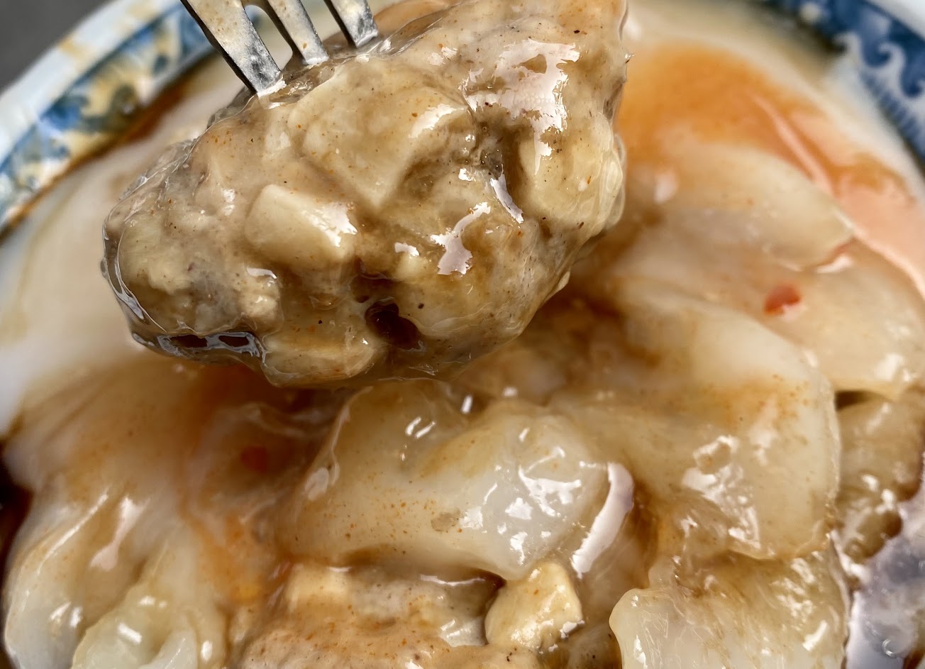 原本看顏色以為是蒸的肉圓,但其實是熱油泡的肉圓。皮吃起來還是軟嫩的,帶著醬汁吃很順口。肉餡是結實富彈性的瘦肉跟筍乾結合,搭配胡椒吃起來清爽不油膩。