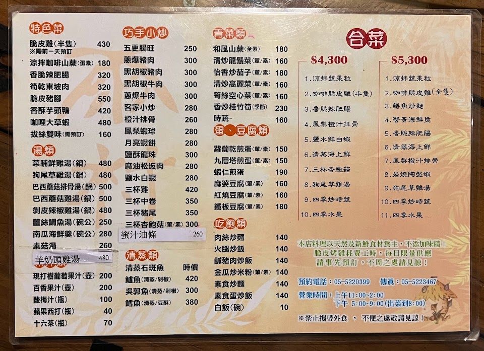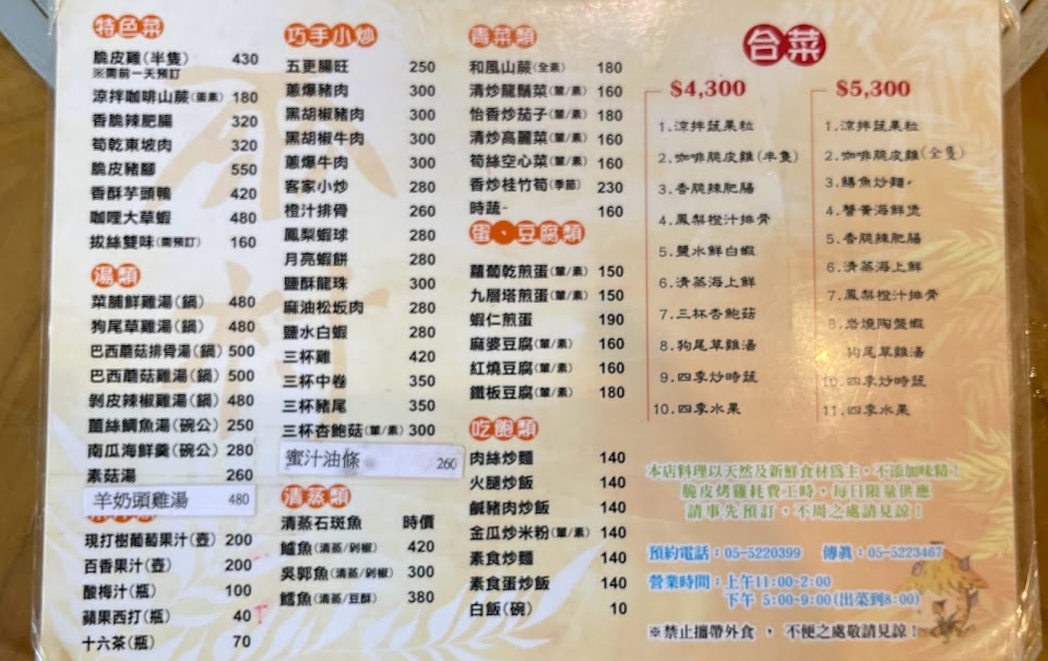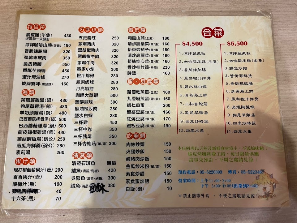十人份合菜5500 元,以這樣的菜色,幾乎是斗六最便宜!